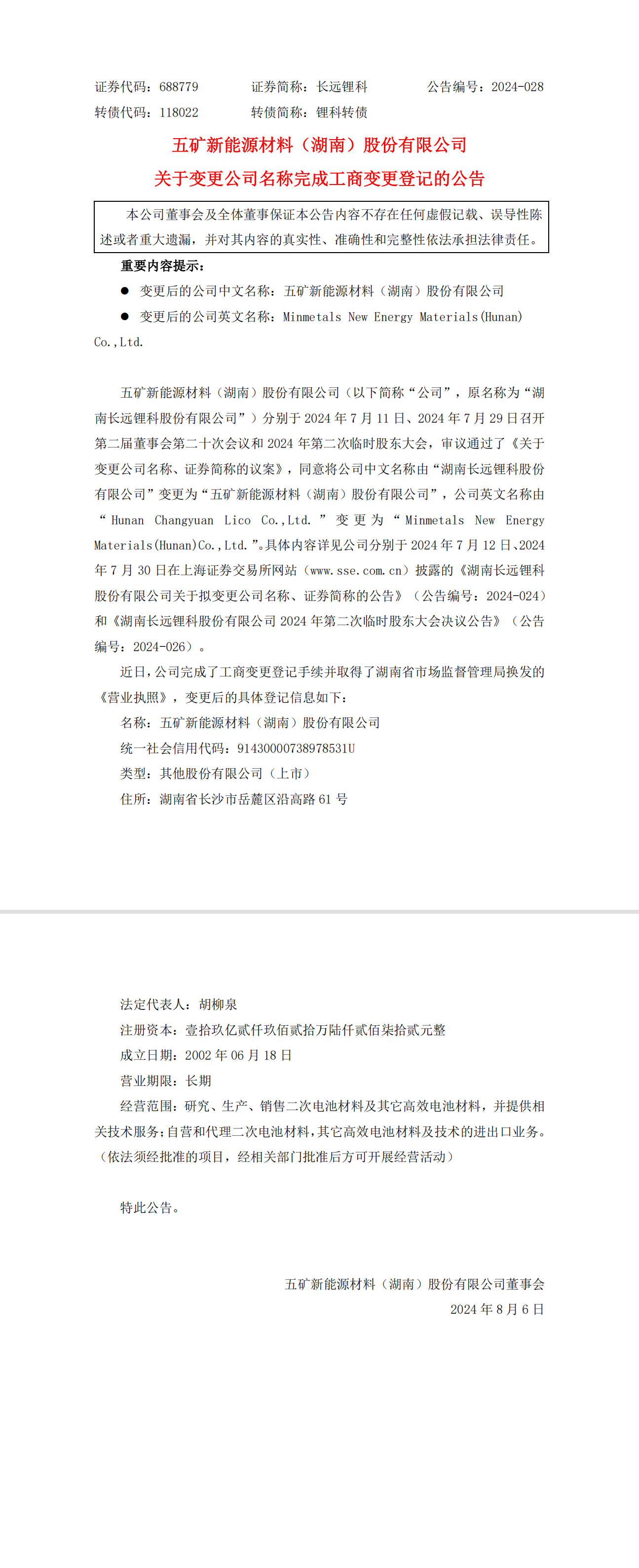 五矿新能源材料(湖南)股份有限公����� �������Ƴ������������ �������Ƴ������������ �������Ƴ������������ �������Ƴ������司关于变更公司名称完成工商变更����� �������� �������Ƴ������������ �������Ƴ������������ �������Ƴ����������� �������Ƴ�����������Ƴ�������登记的公����� �������Ƴ������������ �������Ƴ������������ �������Ƴ������������ �������Ƴ�������告